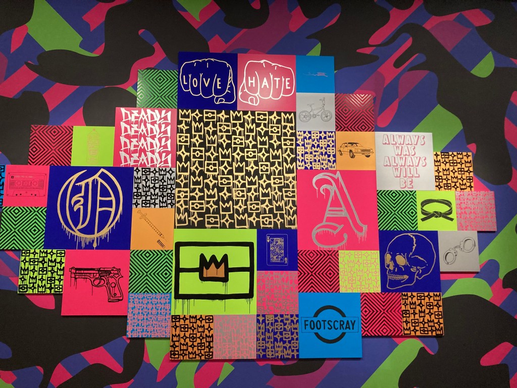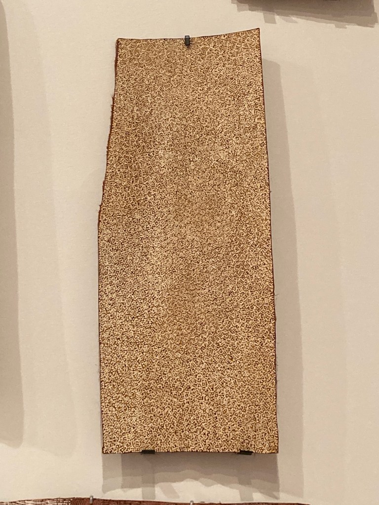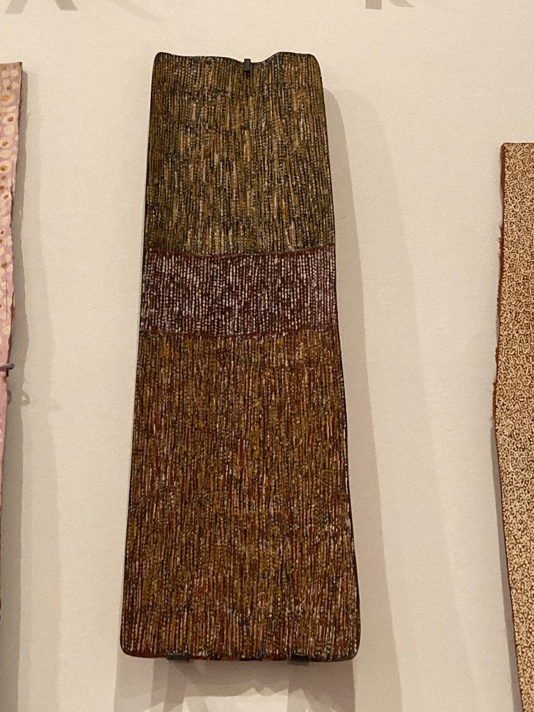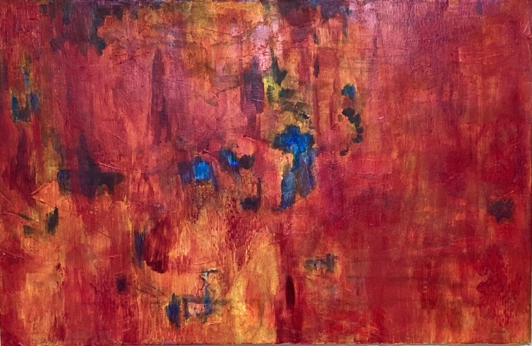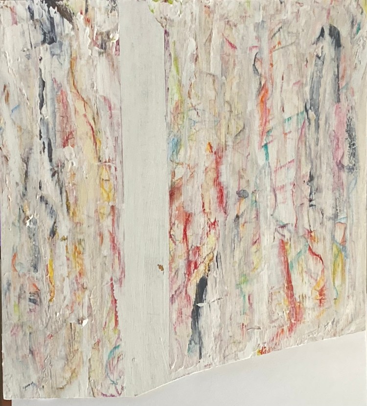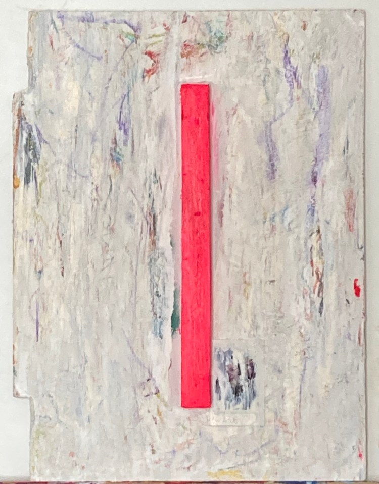 and some of the bigger, more conventionally shaped pieces becoming something quite different. Masking with painter’s tape, layering soft pastels and oil stick, fixing with a homemade concoction of milk and alcohol and then dry brushing with acrylic.